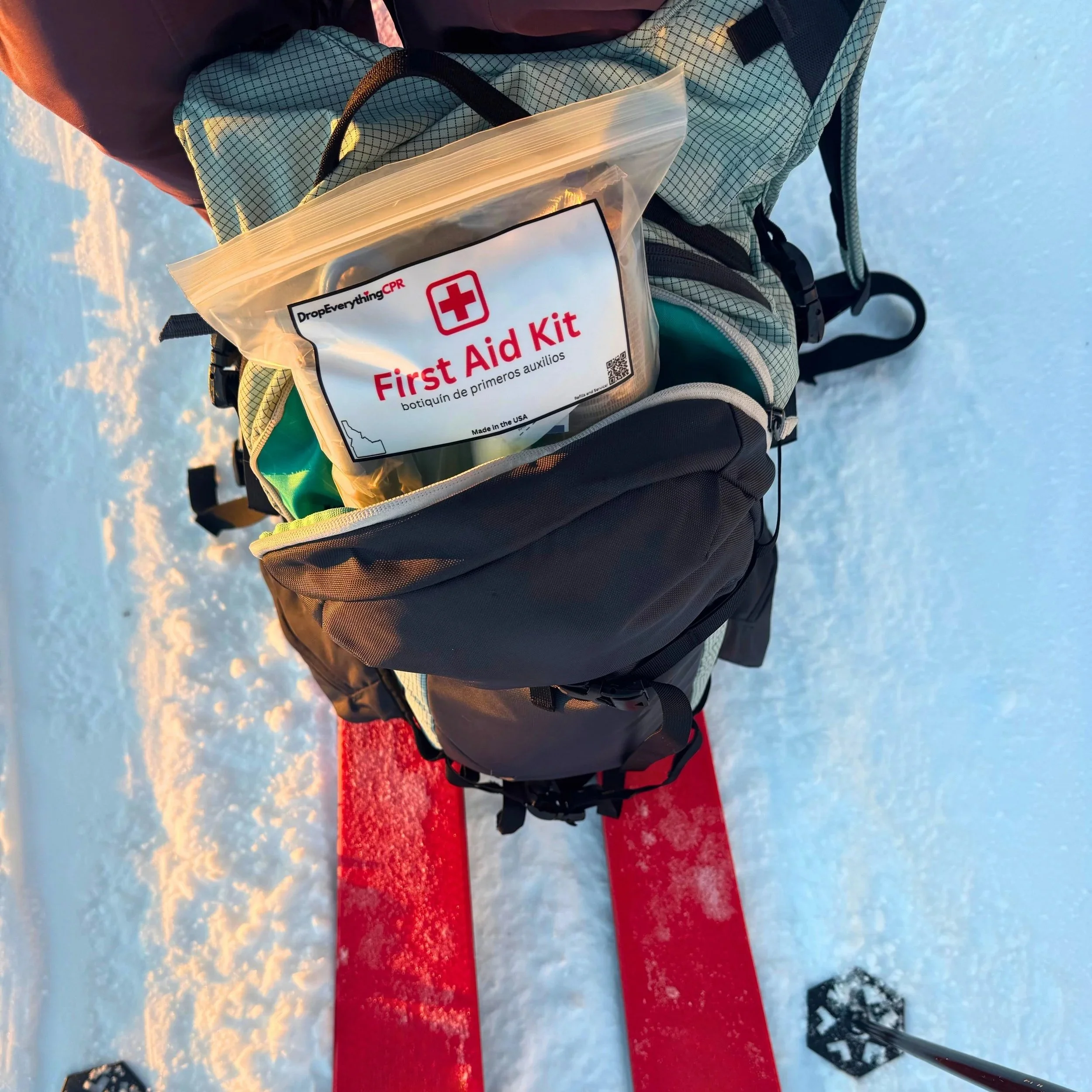 Drop Everything CPR Backcountry First Aid Kits are built for real backcountry emergencies. Each kit focuses on the injuries you’re most likely to encounter when help is far away. Thoughtfully packed, lightweight, and easy to use under stress, these kits are made to live in your pack—not your garage.